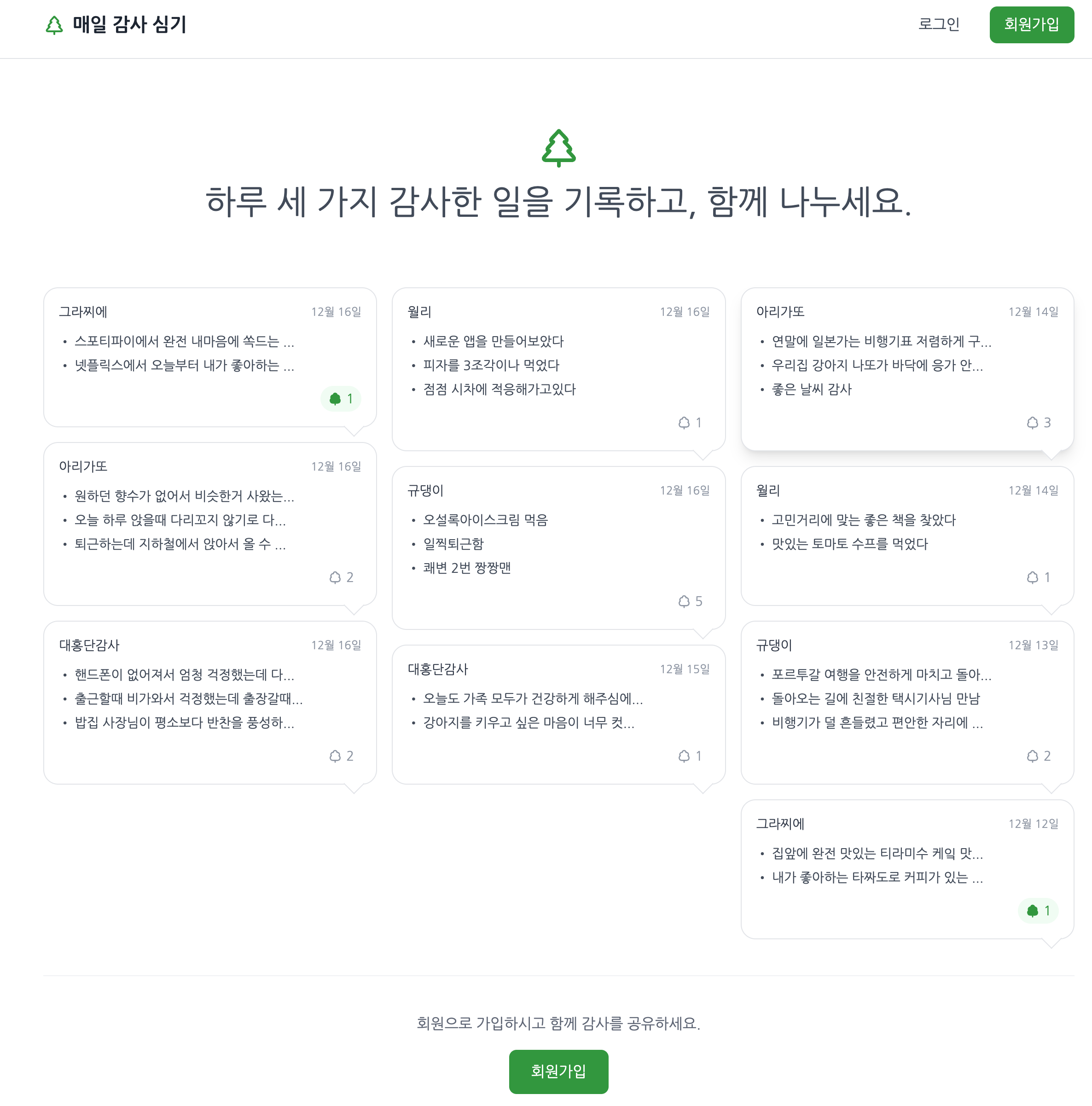 그래서 이 웹사이트의 메인화면에는 회원들이 작성한 모든 감사 일기가 공유됩니다. 현재는 최대 21개의 감사 일기가 메인화면에 보이도록 했습니다. 그리고 메인화면에 공유된 감사 일기를 보고 마음이 따뜻해졌다면 좋아요를 누를 수 있게 했습니다.