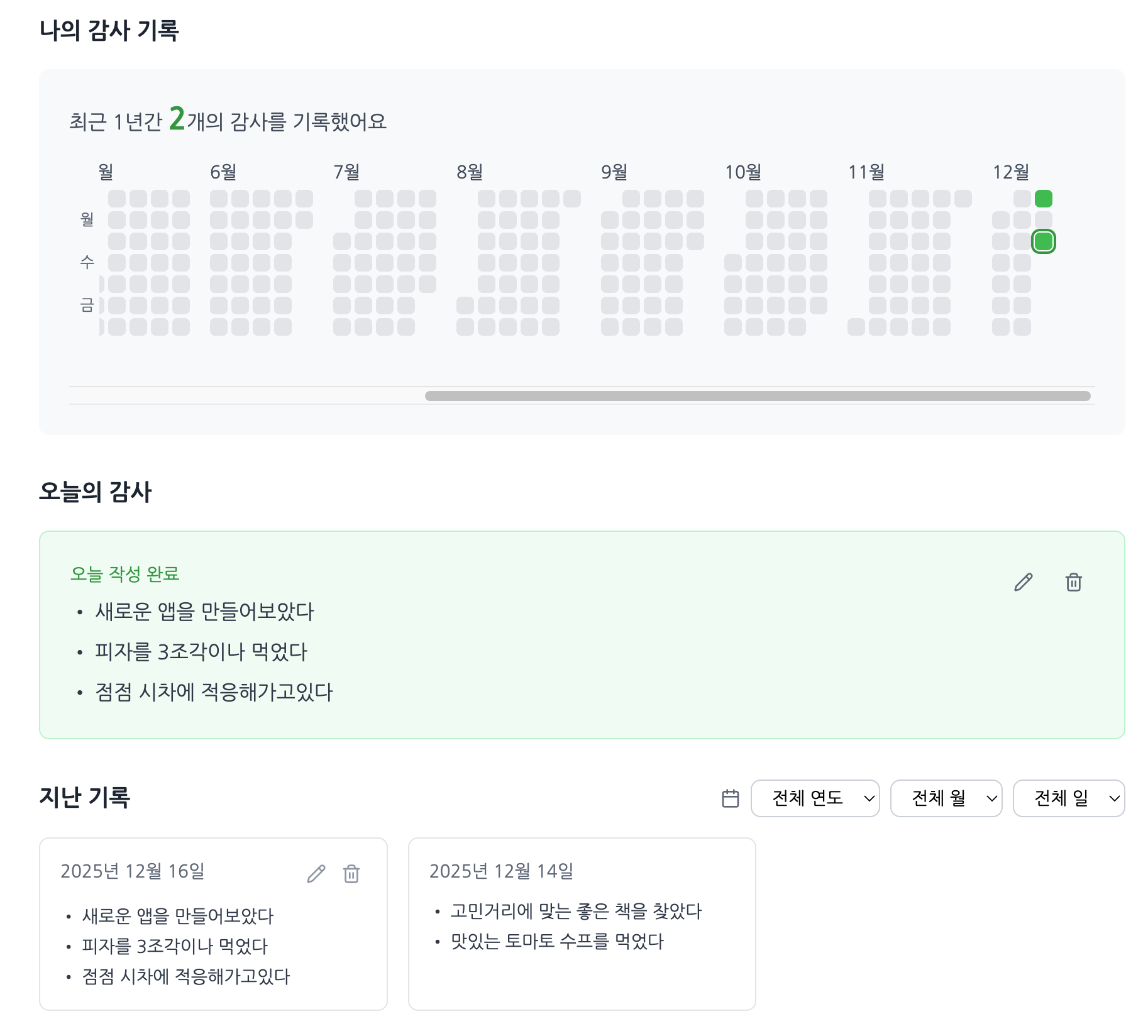 추가로 일기에 대한 수정, 삭제 기능이 누락되어 있다고 말해줘서 그 부분도 구현해달라고 요청했습니다. 그리고 해당 날짜의 감사 일기는 당일에만 작성할 수 있도록 제한했습니다. 지난 날의 감사가 아닌 오늘의 감사를 적는 것이 중요하다고 생각했습니다. 그리고 오늘이 지나면 내일은 그 감사의 마음이 온전히 담기지 않을 것이라고도 생각했거든요.