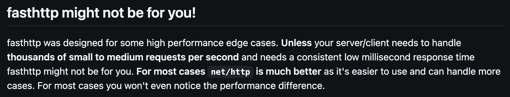 Furthermore, there is no API compatibility between fasthttp and net/http. According to the official documentation, a converter from net/http to fasthttp handlers exists, but they recommend that if you want to adopt fasthttp, it would be much better to re-implement it from scratch.
